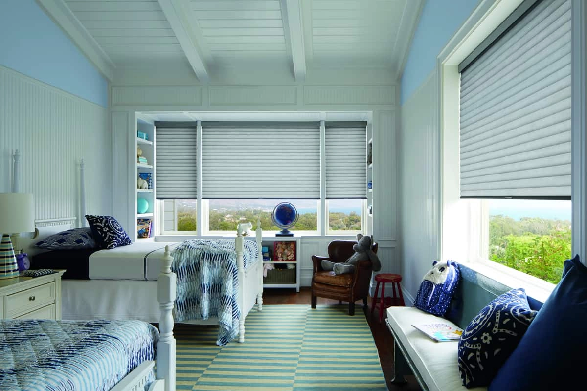 This innovative design from Hunter Douglas features both single and double honeycomb-shaped interiors for the highest degree of energy efficiency and temperature control. Outfit your windows in stunning colors, patterns, and textures all encompass beautifully pleated shades that keep out excessive light and enhance your home’s privacy. Experience premium light control with the revolutionary LightLock™ system that allows you to enjoy your favorite fabrics without sacrificing light blocking capabilities. Duette® offers light filtering to room darkening opacities to choose from, making it a breeze to decorate your home in gorgeous styles unique to every room.